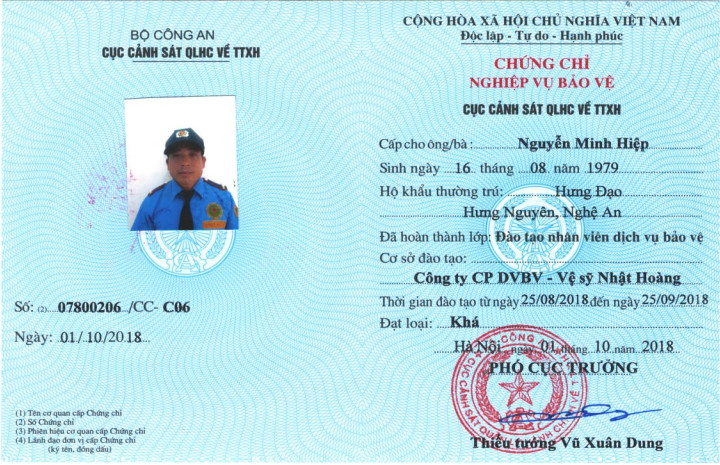 - 02 ảnh chân dung 3x4 (mặc đồng phục bảo vệ, phong màu xanh dương)